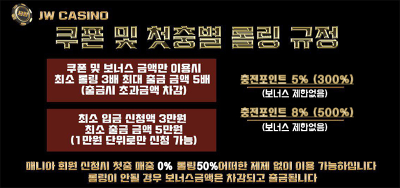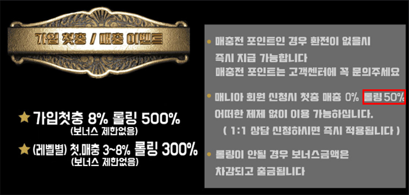 가입 첫충 8% 롤링 5배입니다. 보너스 포인트 지급 없이 롤링 제재를 받기 싫으신 회원분은 고객센터로 매니아 회원을 요청하시고 자유롭게 이용하셔도 됩니다. (단, 자금세탁 악용을 방지하기 위하여 최소 롤링 50% 규정이 있습니다.) |